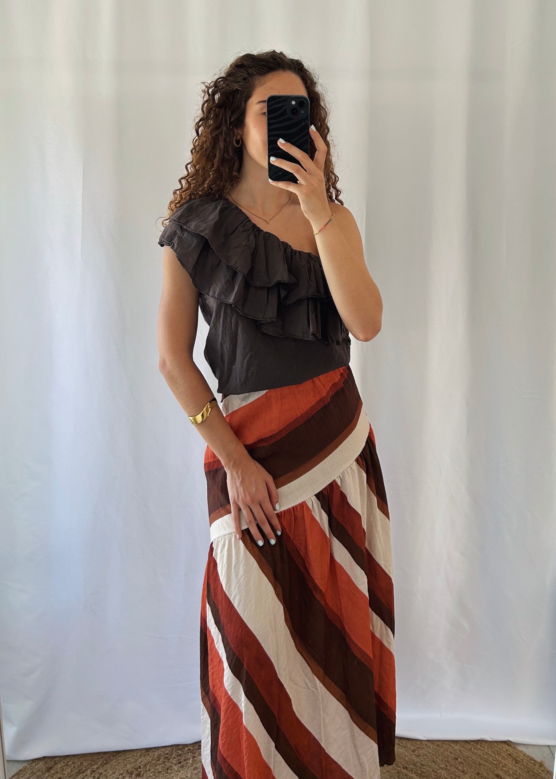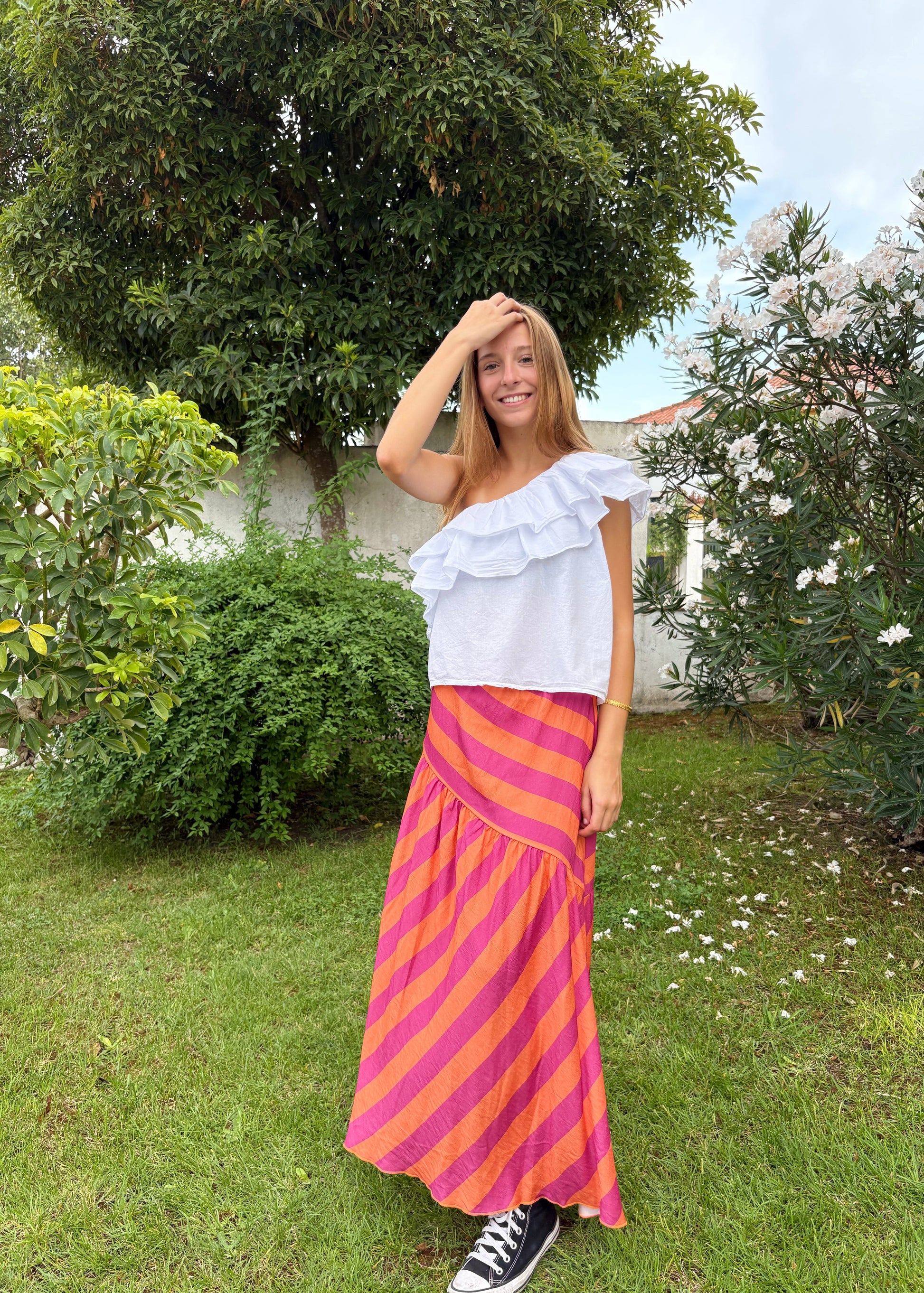 A Blusa de Um Ombro com Folhos combina delicadeza e sofisticação num só modelo. O detalhe de folhos em camadas no decote acrescenta volume e elegância, enquanto o corte assimétrico confere um toque moderno e distinto. Versátil e confortável, adapta-se facilmente a looks mais casuais ou produções elegantes, perfeita para se destacar com estilo.
