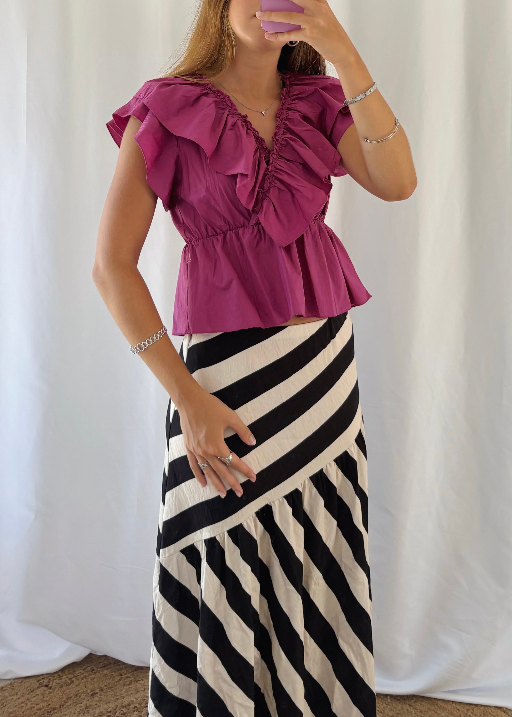 A Blusa com Folhos e Decote em V é a peça perfeita para quem gosta de um toque romântico sem perder a elegância. O detalhe de folhos em toda a zona do decote acrescenta charme e movimento, enquanto o corte cintado valoriza a silhueta. Ideal para compor looks leves e sofisticados, tanto para o dia como para a noite.