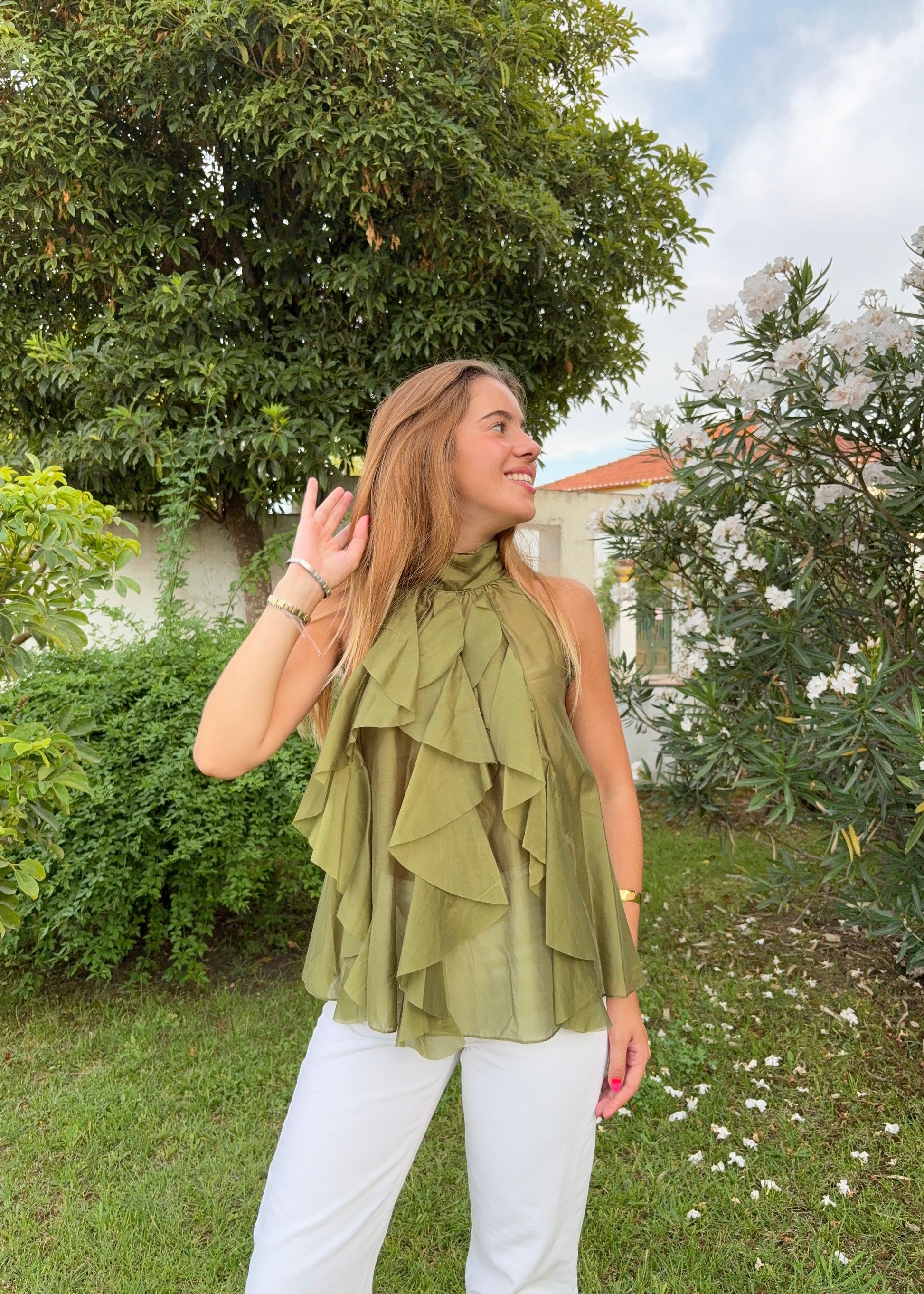 A Blusa de Gola Alta com Folhos combina elegância e leveza, tornando-se uma peça versátil para qualquer ocasião. O corte fluido e as camadas de folhos garantem movimento e sofisticação, enquanto a gola alta acrescenta um toque clássico e intemporal. Produzida em tecido leve e confortável, adapta-se facilmente a diferentes estilos, do casual ao formal.