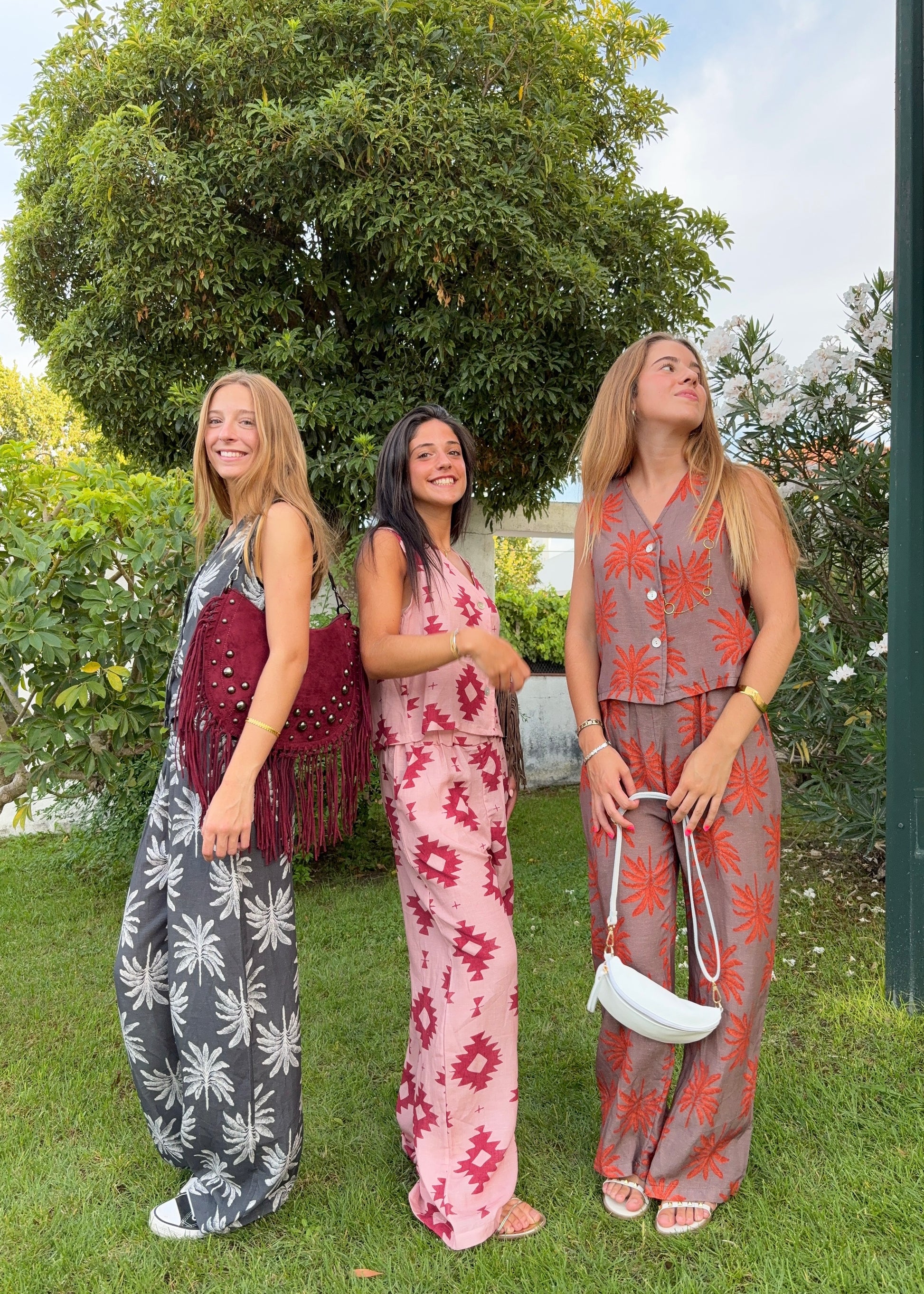 O Conjunto Estampado é a combinação perfeita de conforto e estilo. Composto por calças de corte fluido e top sem mangas, oferece um visual descontraído mas cheio de personalidade. O tecido leve proporciona liberdade de movimento, tornando-o ideal para dias de calor ou ocasiões casuais com um toque especial.