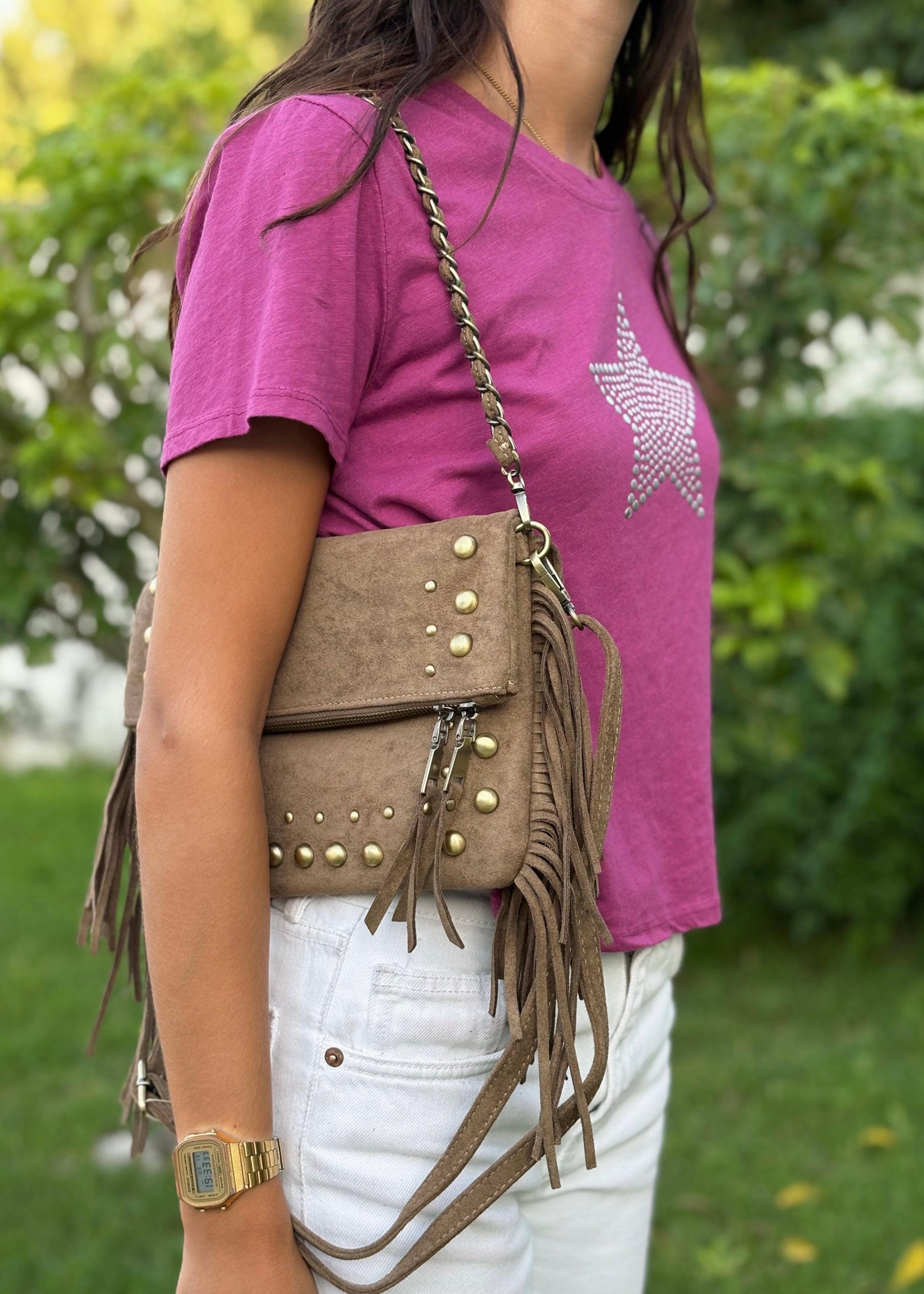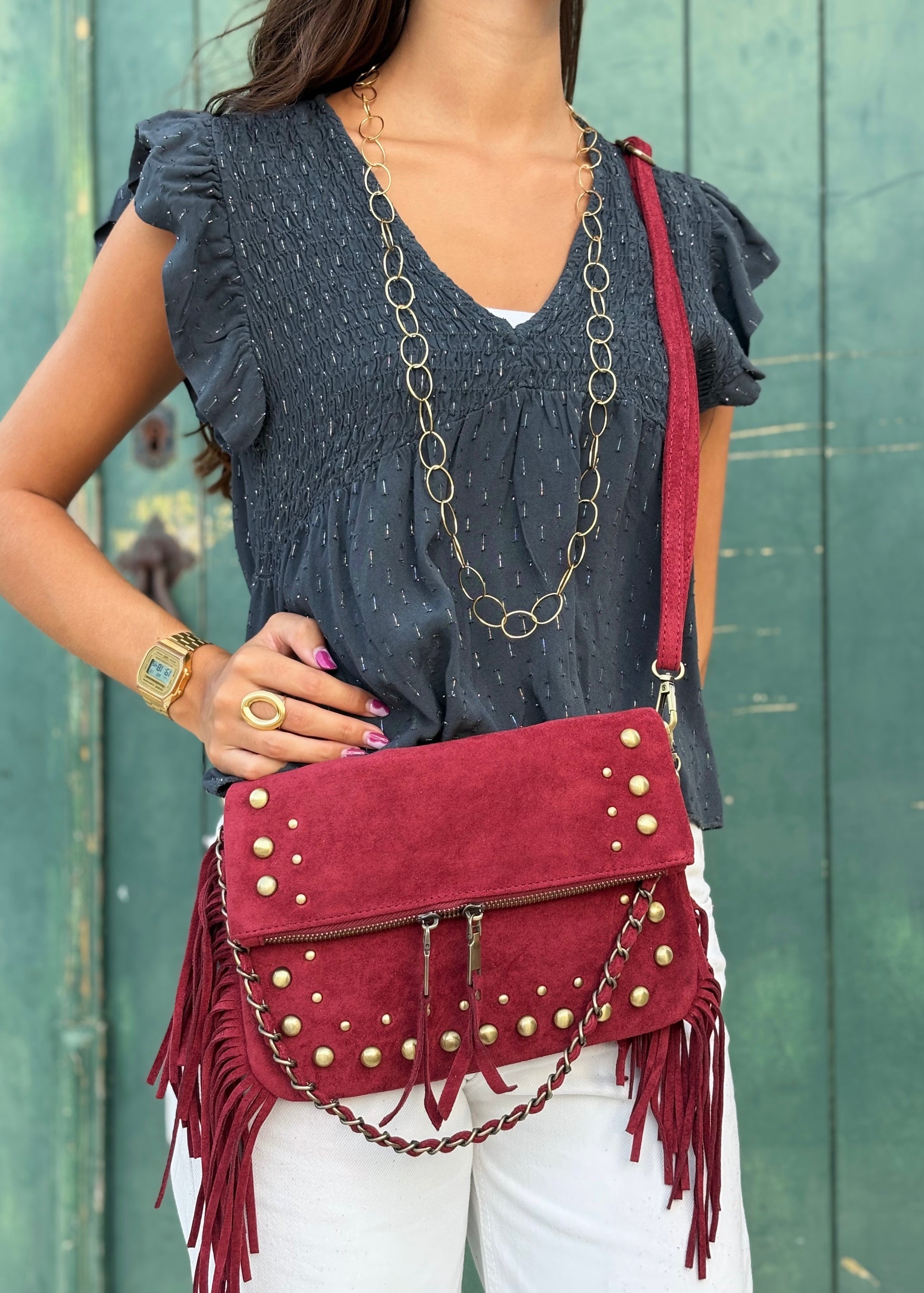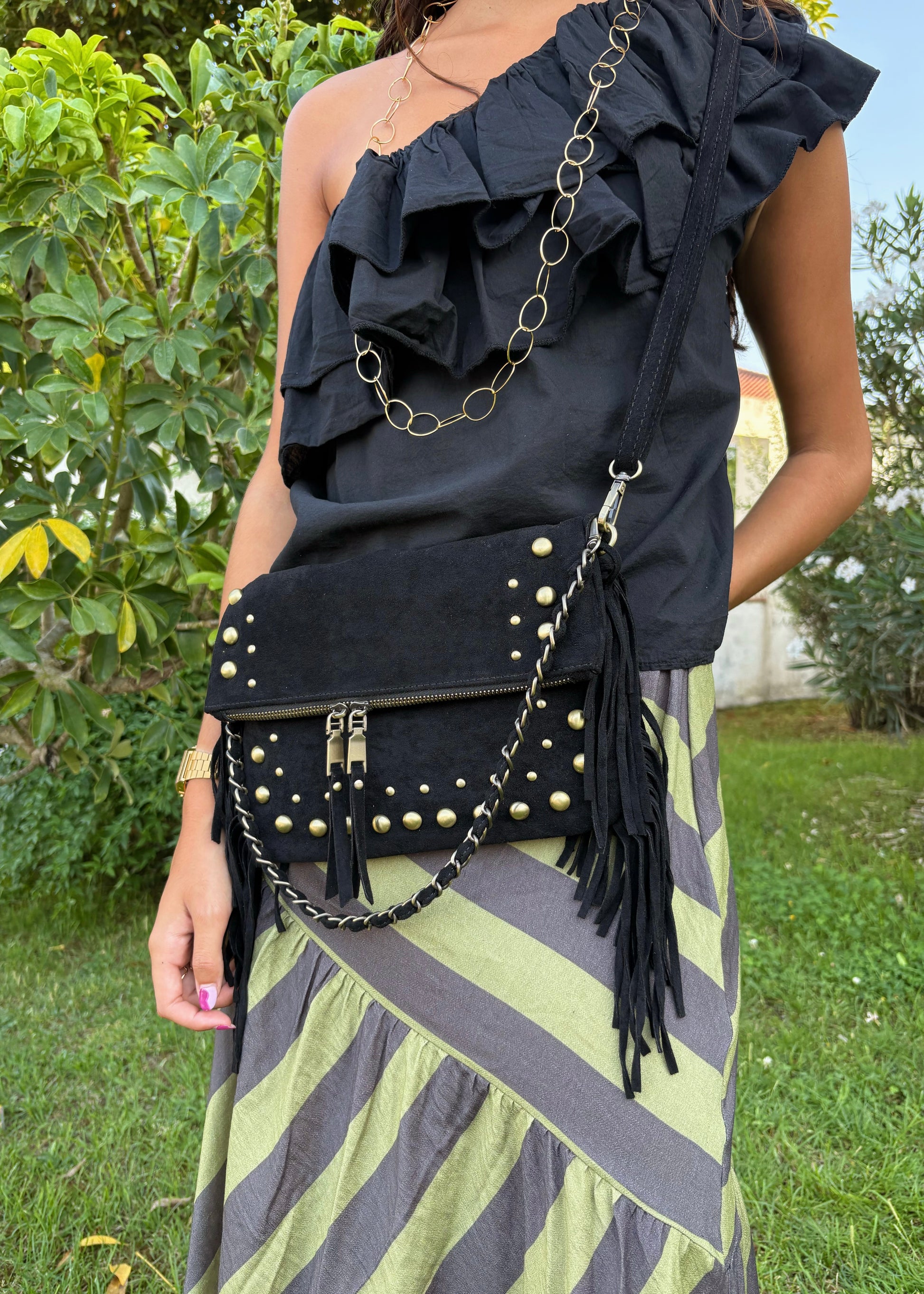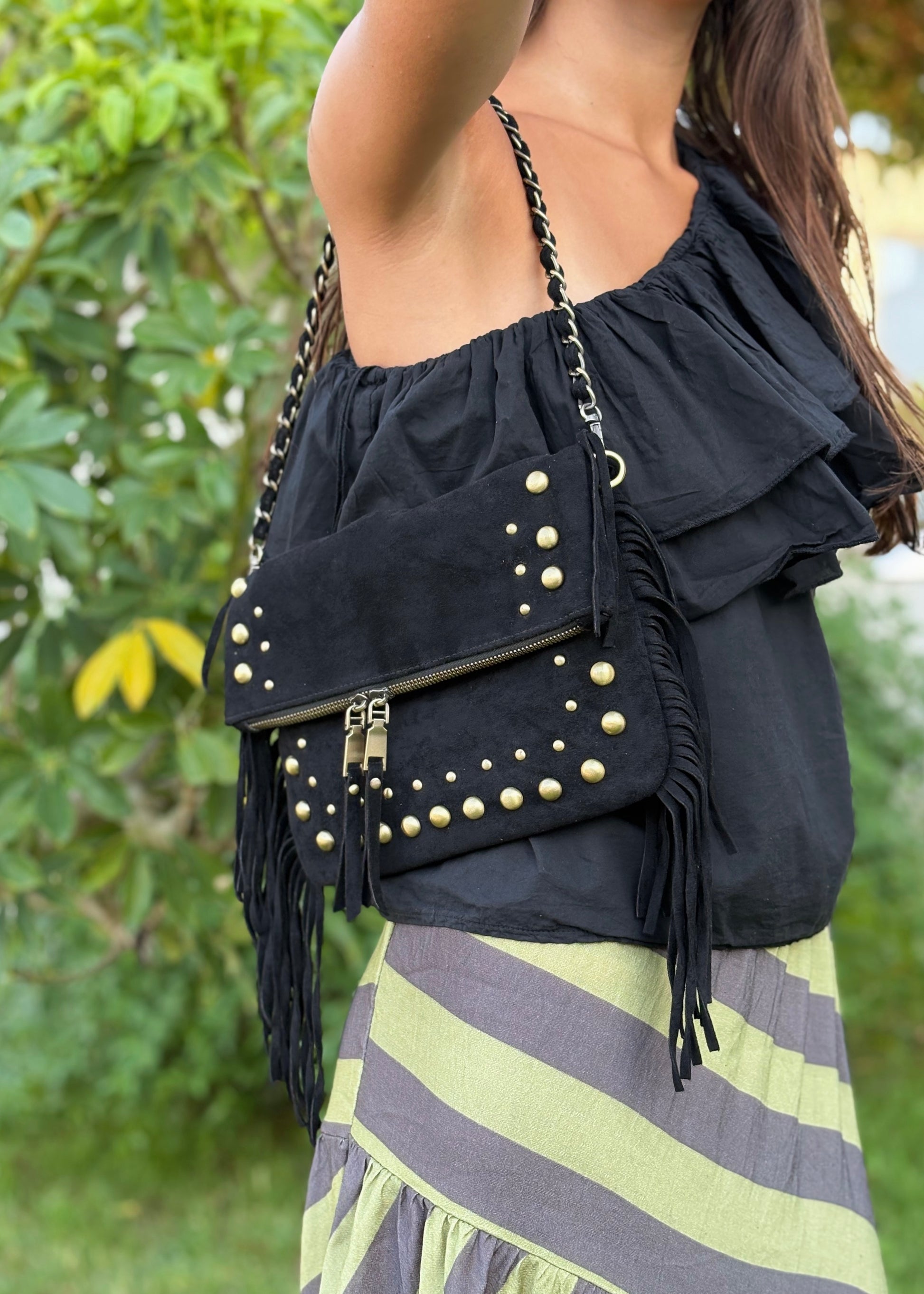 - Estilo: Envelope boho com franjas laterais e tachas metálicas