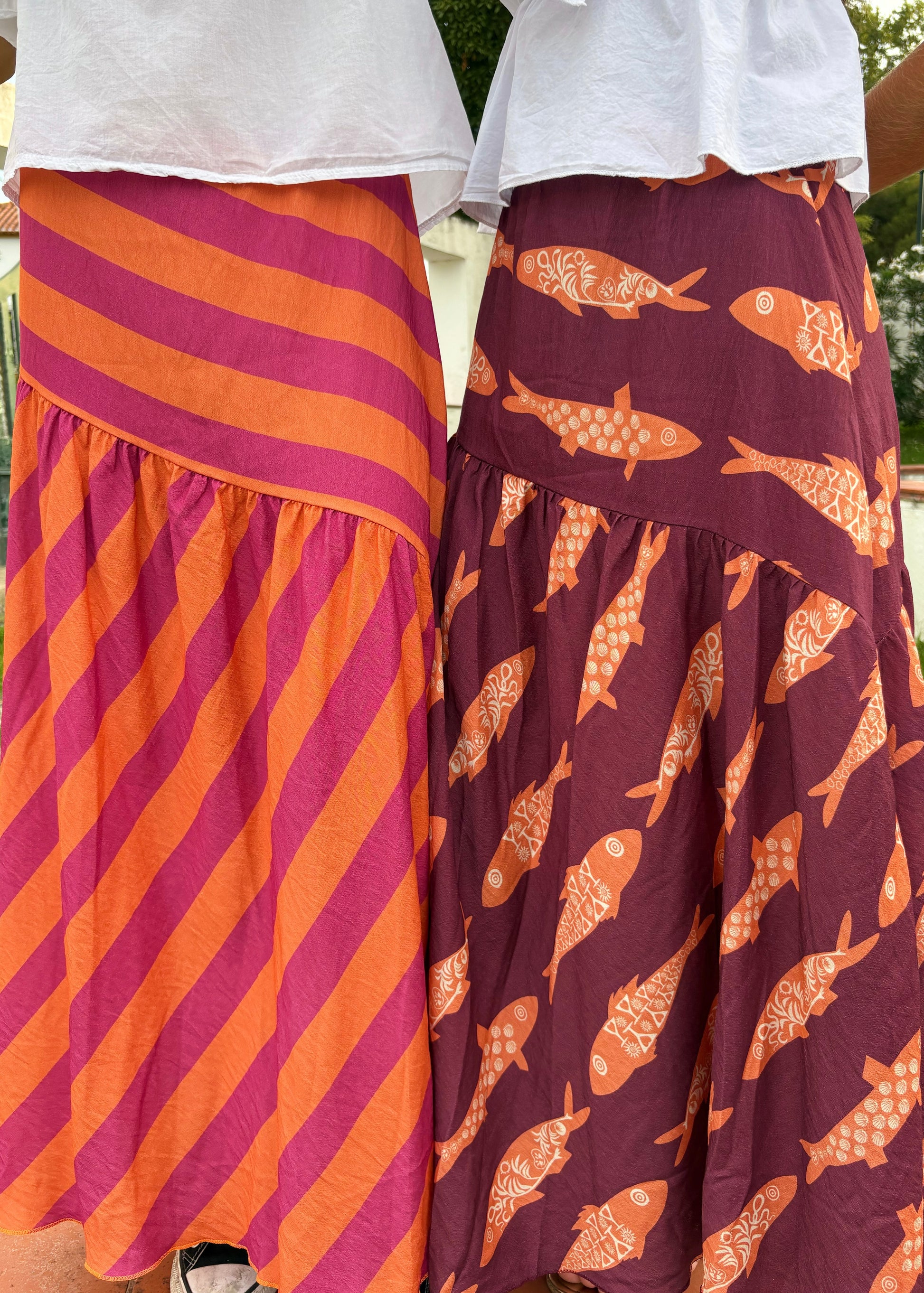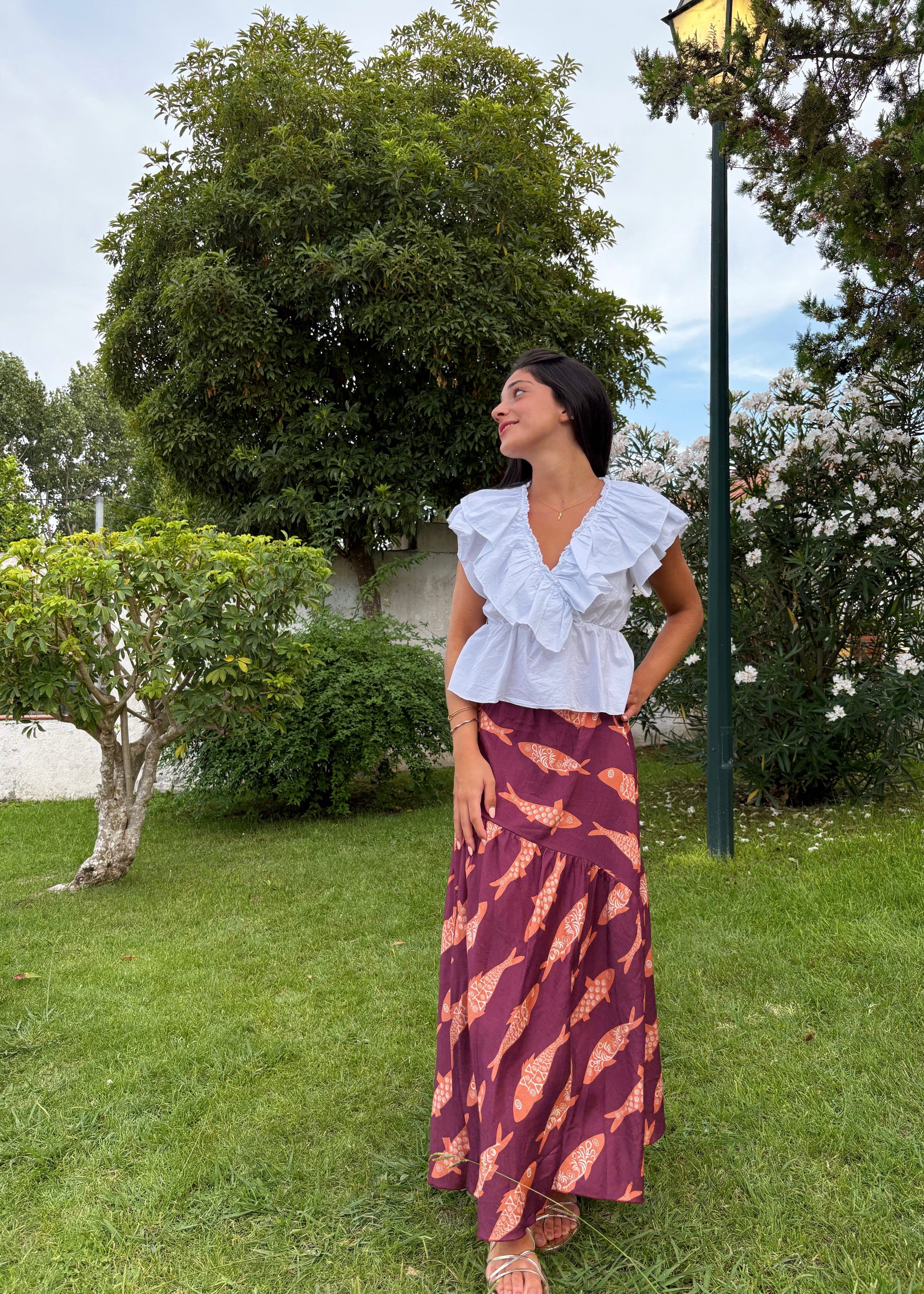 A Saia Comprida Estampada combina movimento, fluidez e estilo num só modelo. O corte em camadas e o padrão marcante garantem um visual moderno e cheio de personalidade. Ideal para usar tanto em looks casuais como em ocasiões especiais, adaptando-se a diferentes estilos.