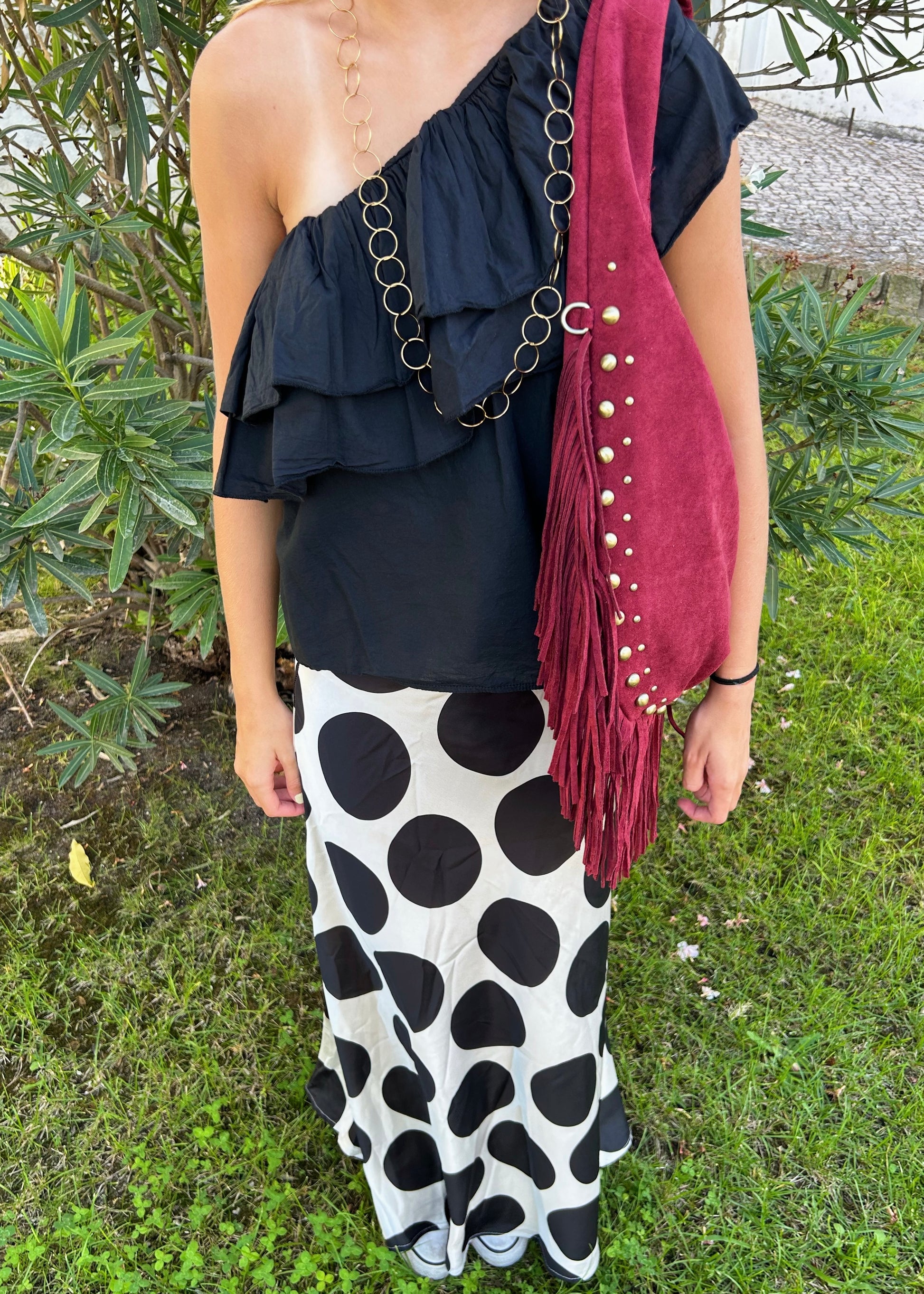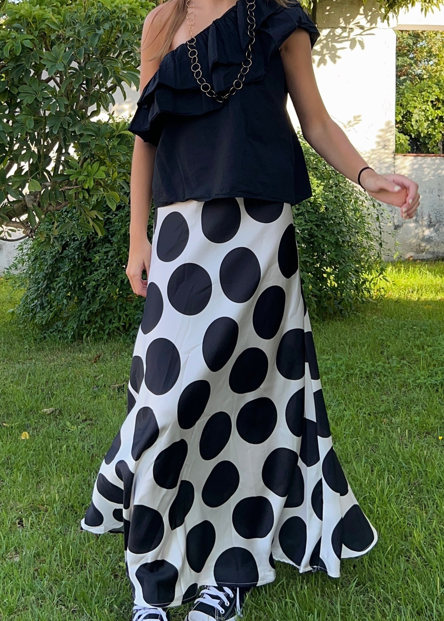 A Saia Midi Bolas Grandes combina elegância e irreverência num só look. Composta por um tecido leve e fluido, apresenta um padrão de bolas grandes em preto e branco que chama a atenção de forma moderna e divertida. Ideal para looks que exigem movimento e estilo em qualquer ocasião.
