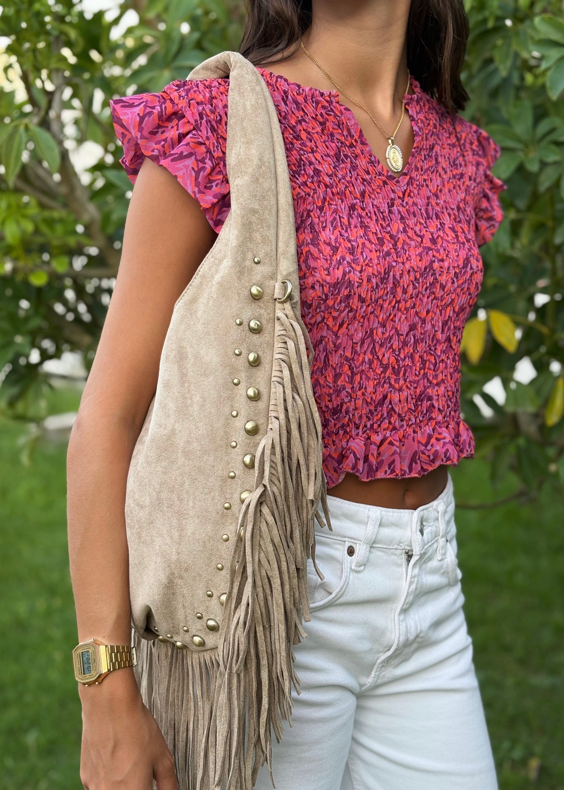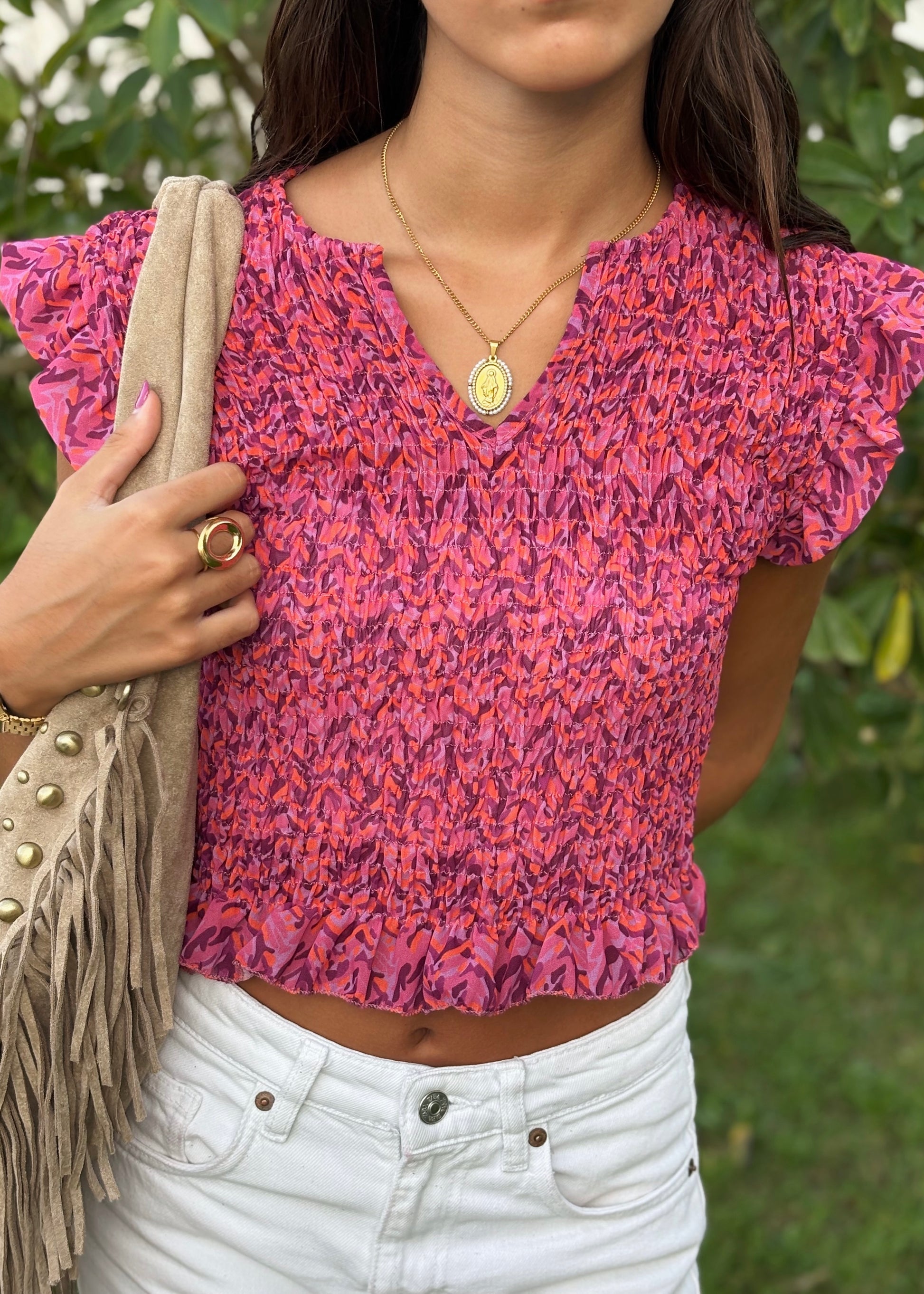O Top Estampado com Elástico e Mangas Curta em Folho é uma peça leve e feminina, perfeita para looks de verão cheios de cor. Com padrão vibrante em tons de rosa e roxo, apresenta corpo em tecido elástico franzido que garante ajuste confortável e valorizador. As mangas curtas com folho acrescentam um toque romântico e delicado, tornando-o ideal para combinar com calças, saias ou calções.