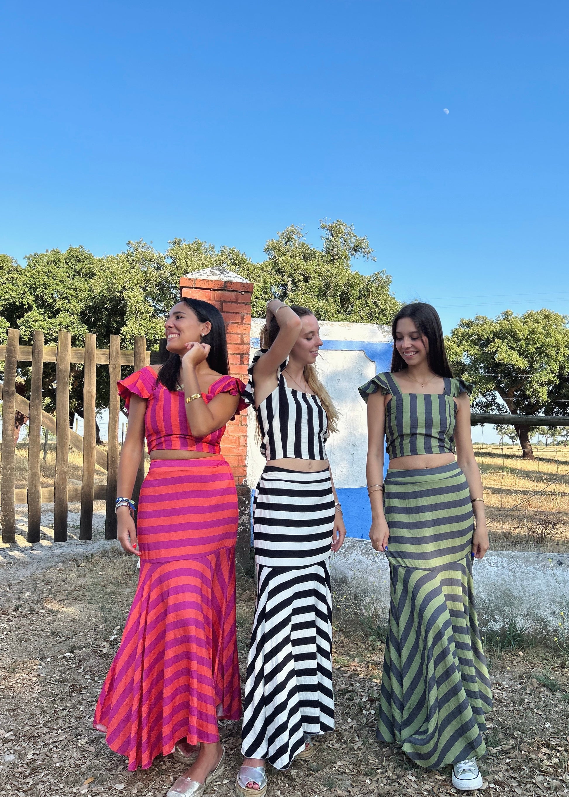 O Top às Riscas com Mangas Volantes é uma peça leve e cheia de charme, perfeita para criar looks de verão elegantes e descontraídos. O corte ajustado realça a silhueta, enquanto as mangas em volante acrescentam um toque romântico.