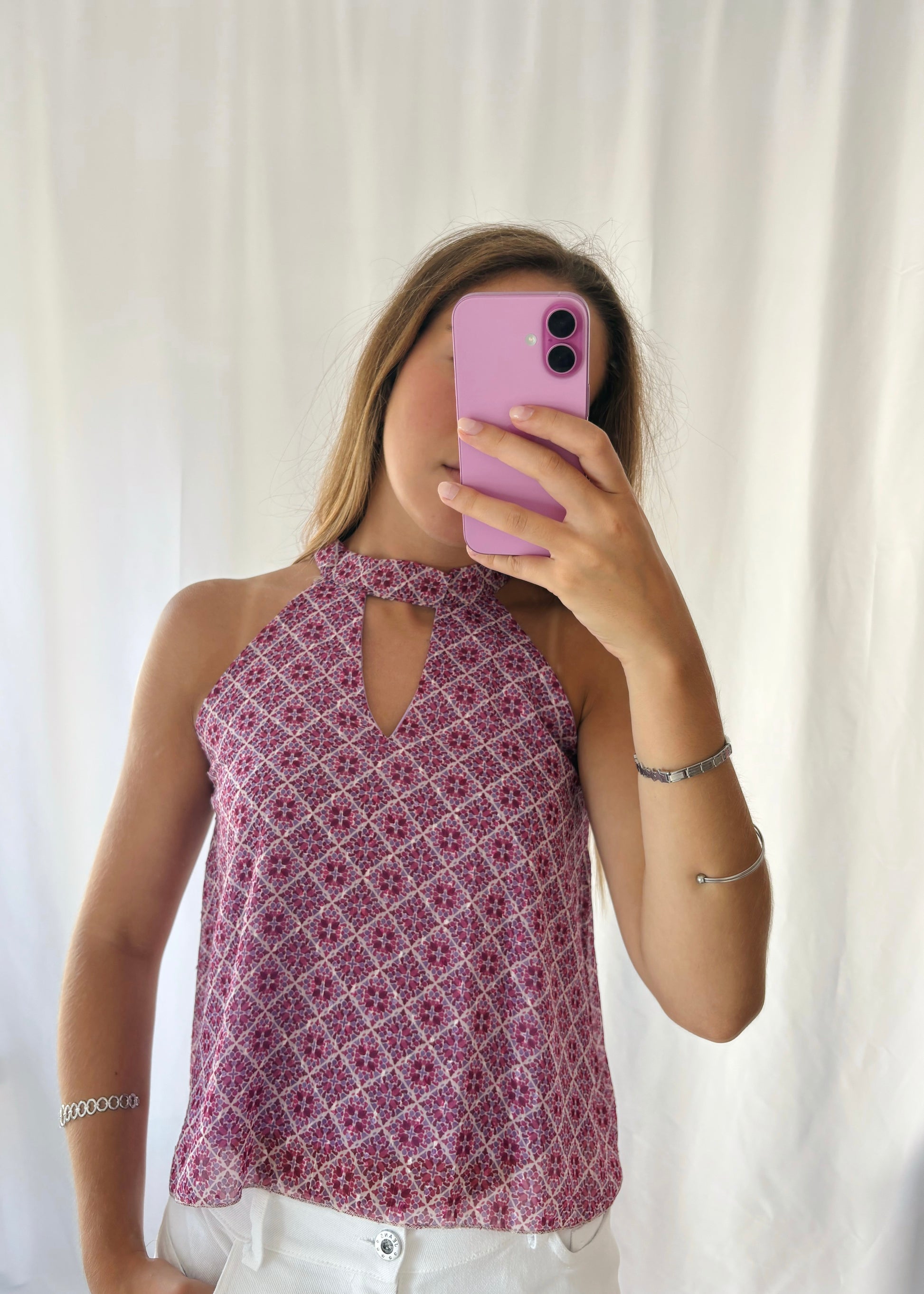 O Top Estampado com Abertura Frontal é uma peça versátil e cheia de estilo, perfeita para dias quentes. O corte solto e leve proporciona conforto, enquanto a pequena abertura frontal acrescenta um detalhe moderno e delicado.