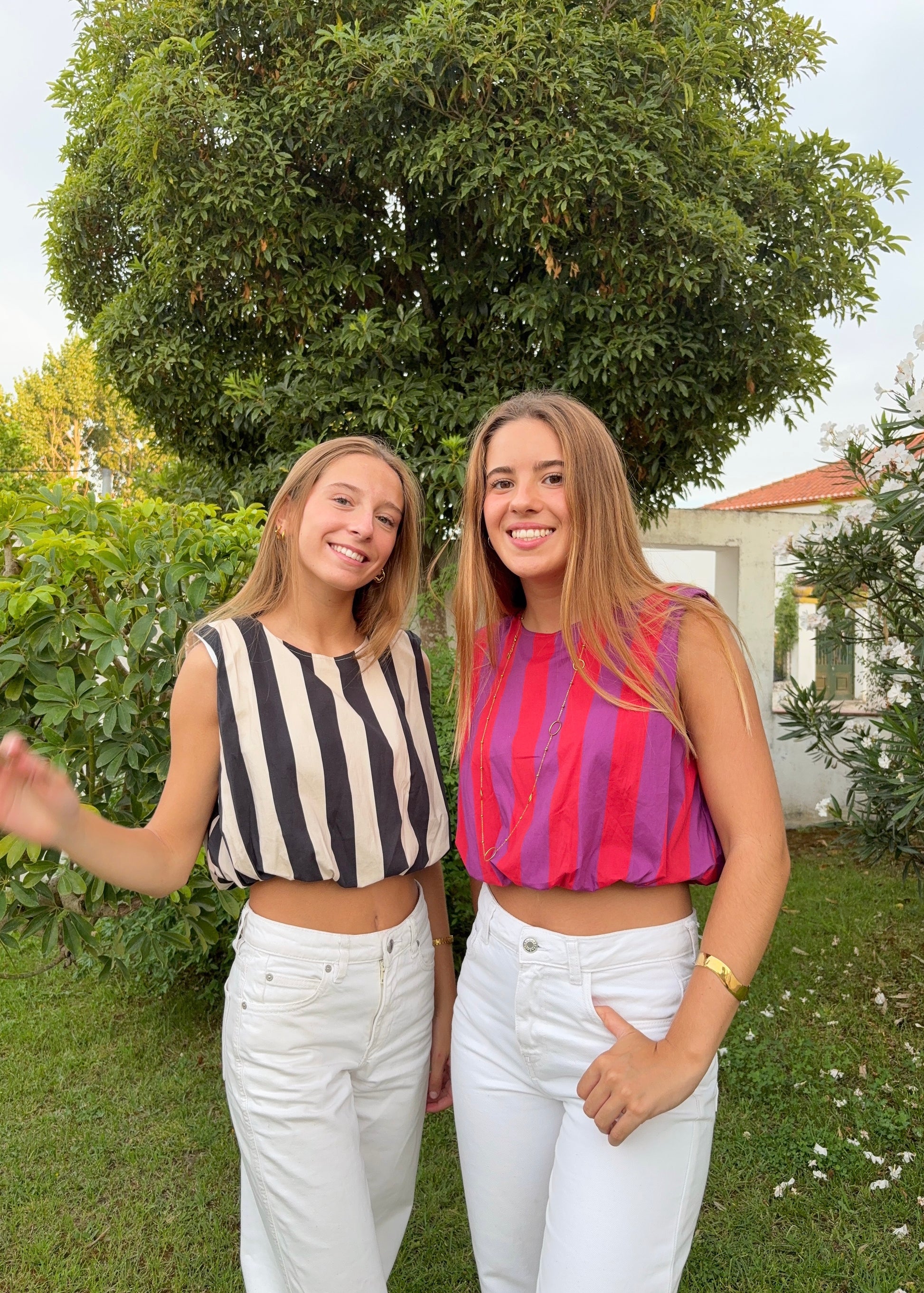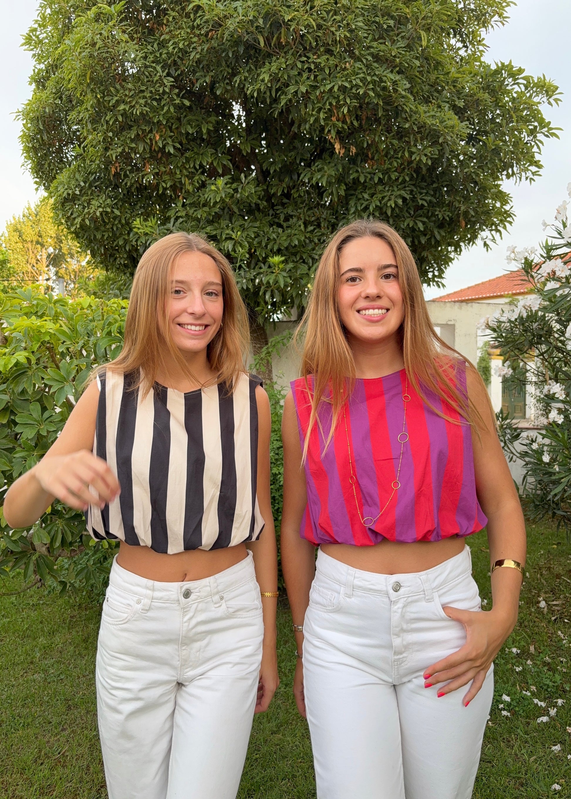 O Top Cropped em Riscas é a escolha ideal para quem procura frescura e estilo num só. Com corte reto e caimento leve, adapta-se perfeitamente aos tamanhos XS ao S, garantindo conforto sem perder a elegância. Disponível em duas combinações de cores – preto com bege e vermelho com roxo – é versátil e fácil de combinar com jeans, calções ou saias. As riscas verticais ajudam a alongar a silhueta, tornando-o perfeito para qualquer ocasião de verão.