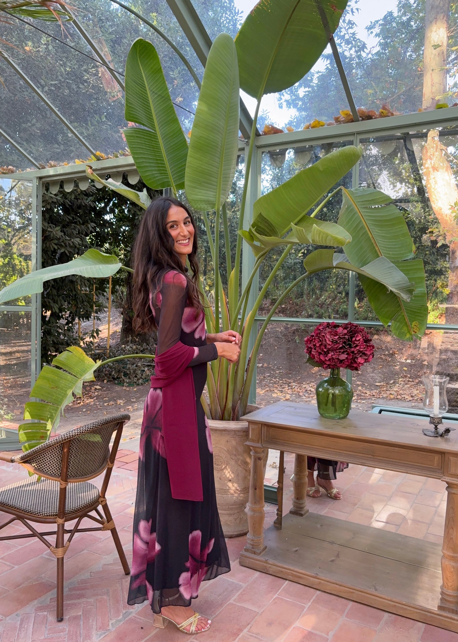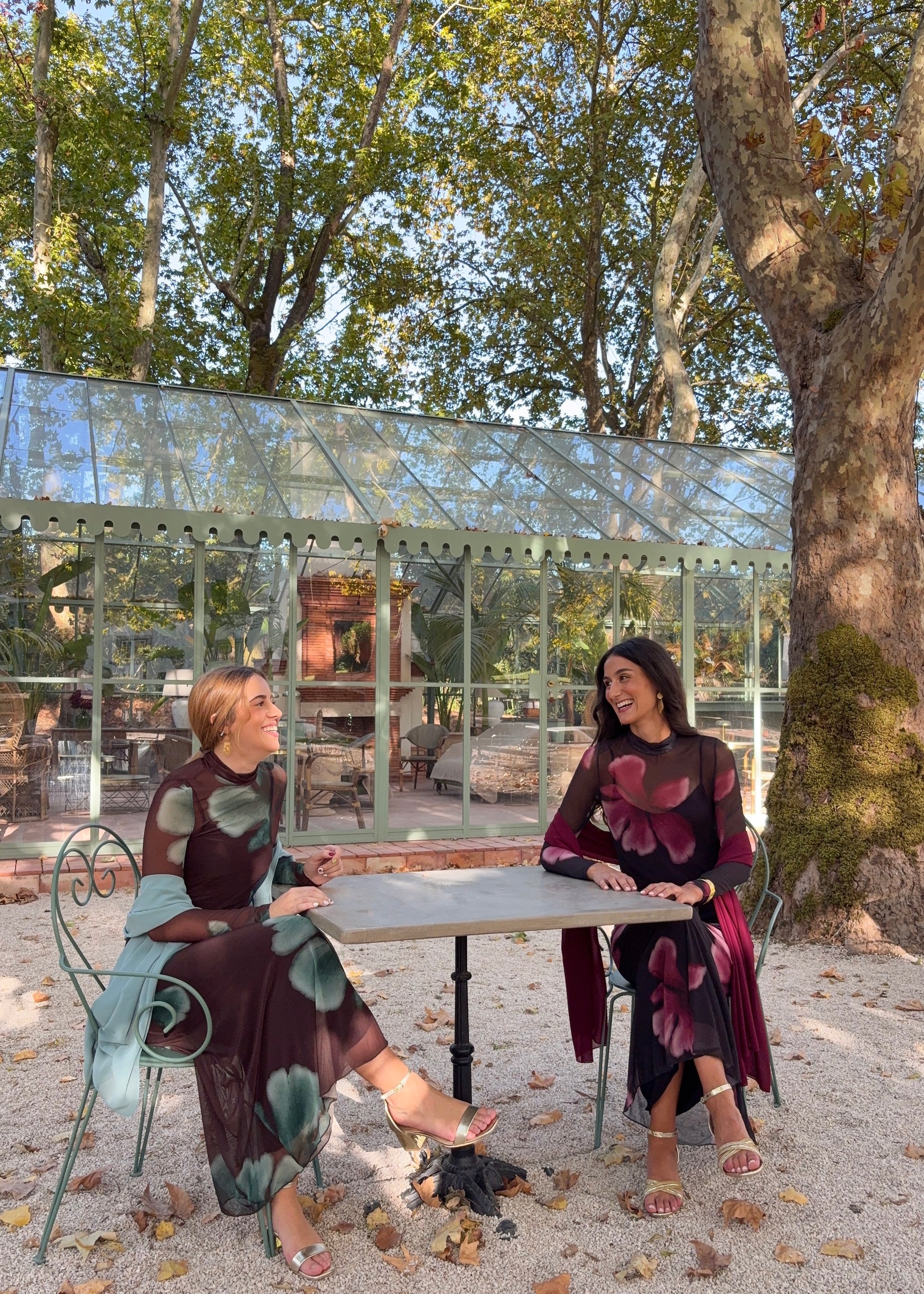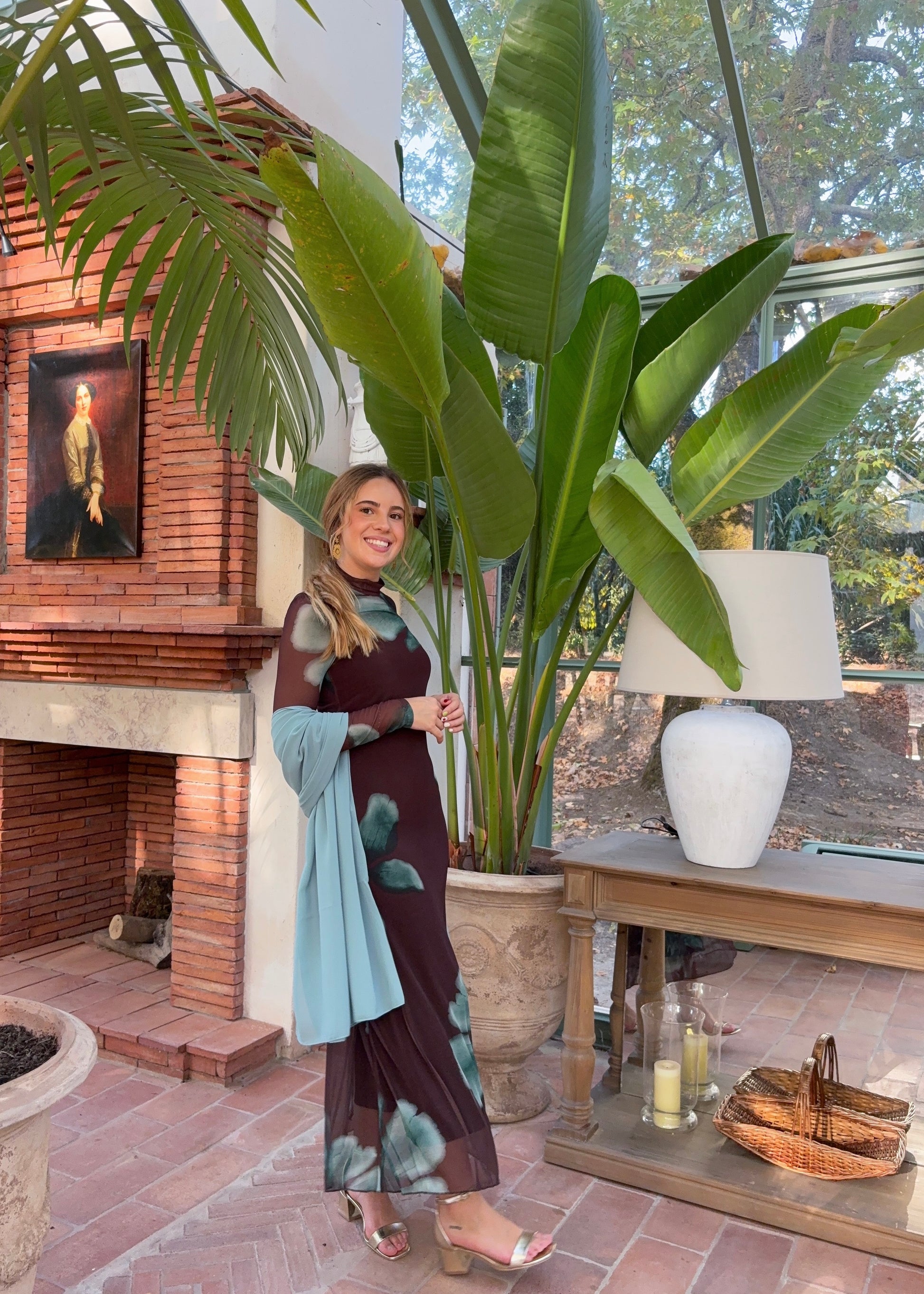 Vestido elegante com decote ombro a ombro drapeado, mangas compridas em tule e padrão delicado. O corte fluido cria uma silhueta sofisticada e feminina, perfeito para ocasiões especiais.