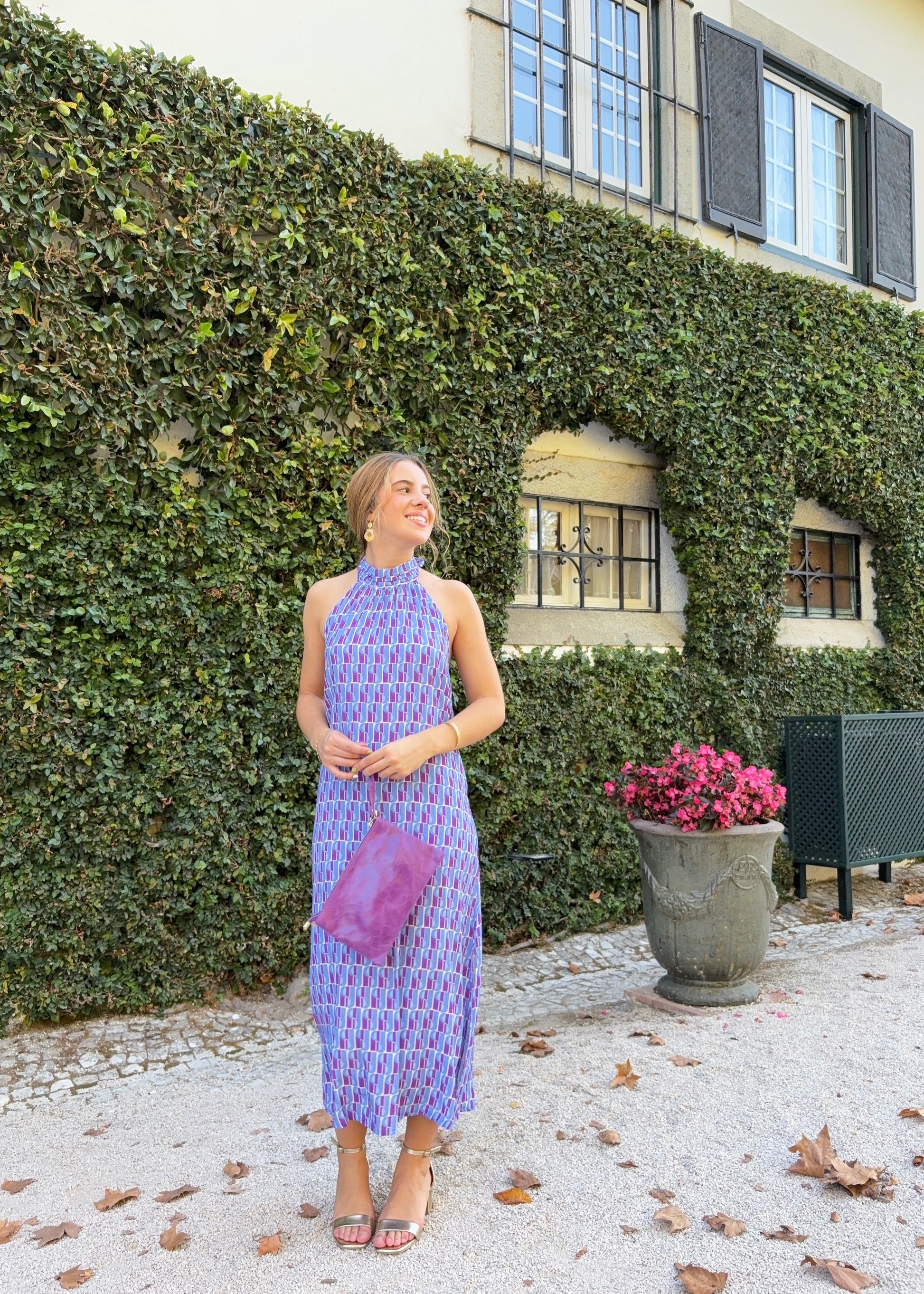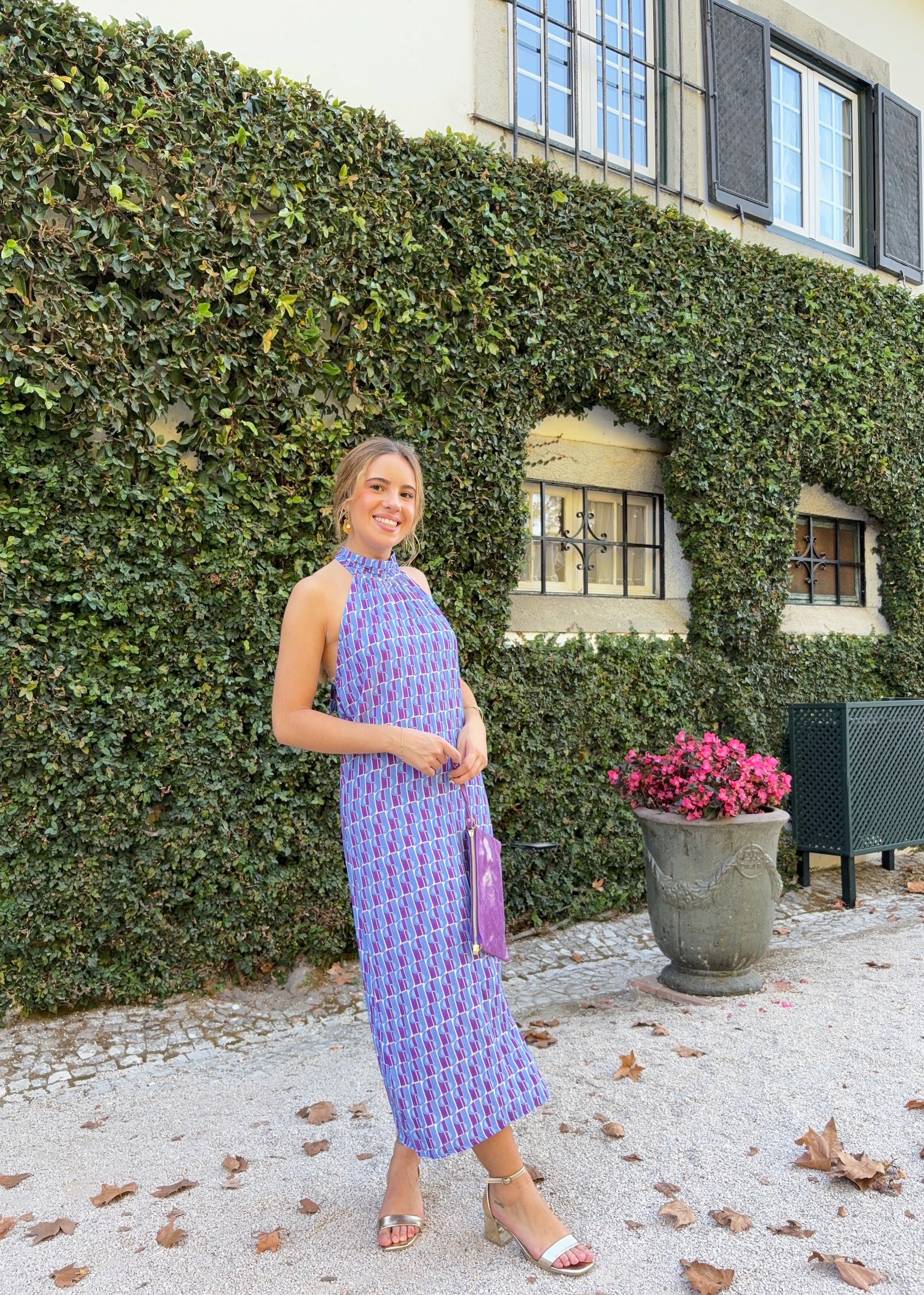 Um vestido midi elegante e leve, com decote halter que realça os ombros de forma delicada. O corte fluido cria um movimento bonito a cada passo, perfeito para cerimónias ou eventos especiais. Um look sofisticado, confortável e cheio de charme.