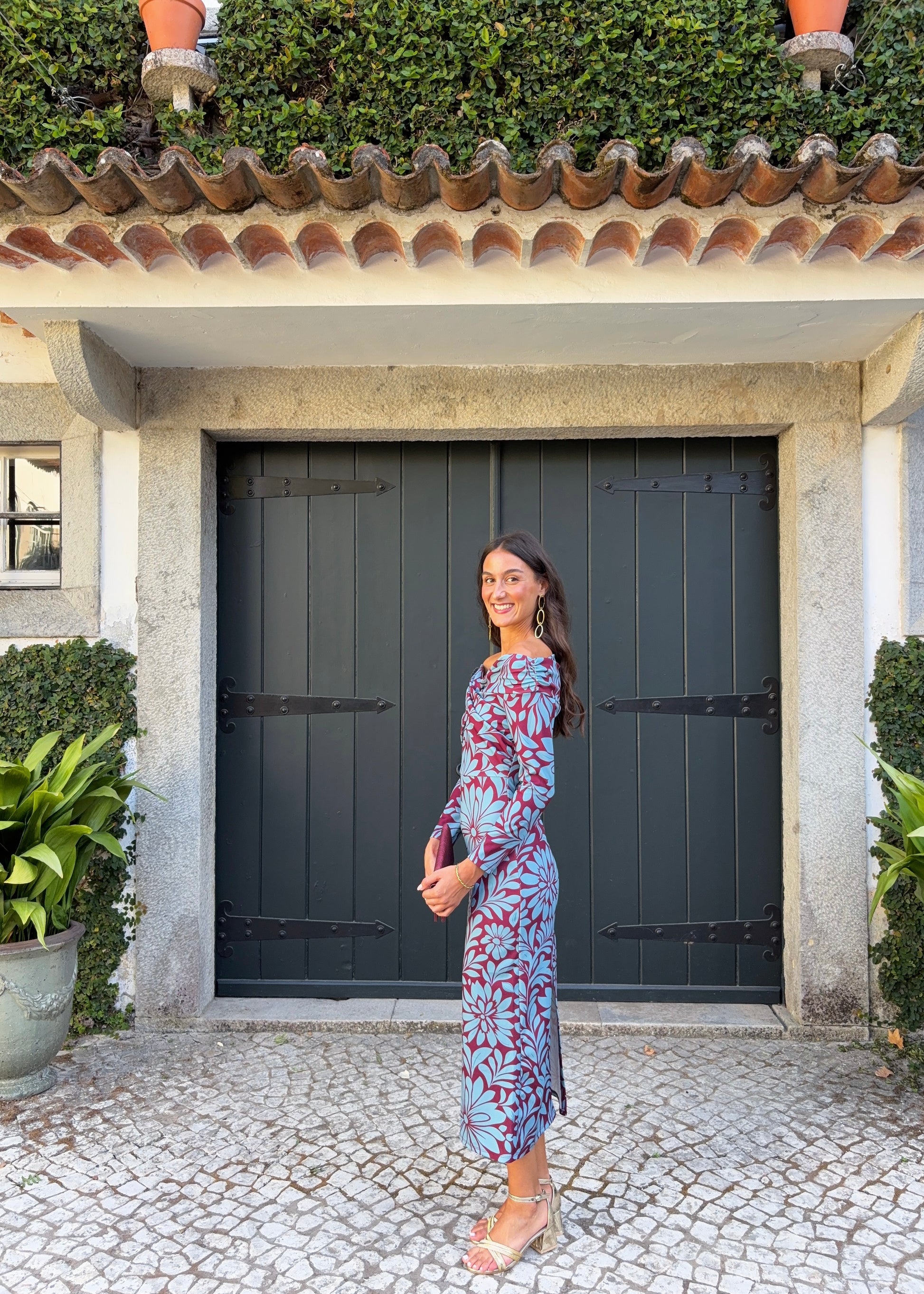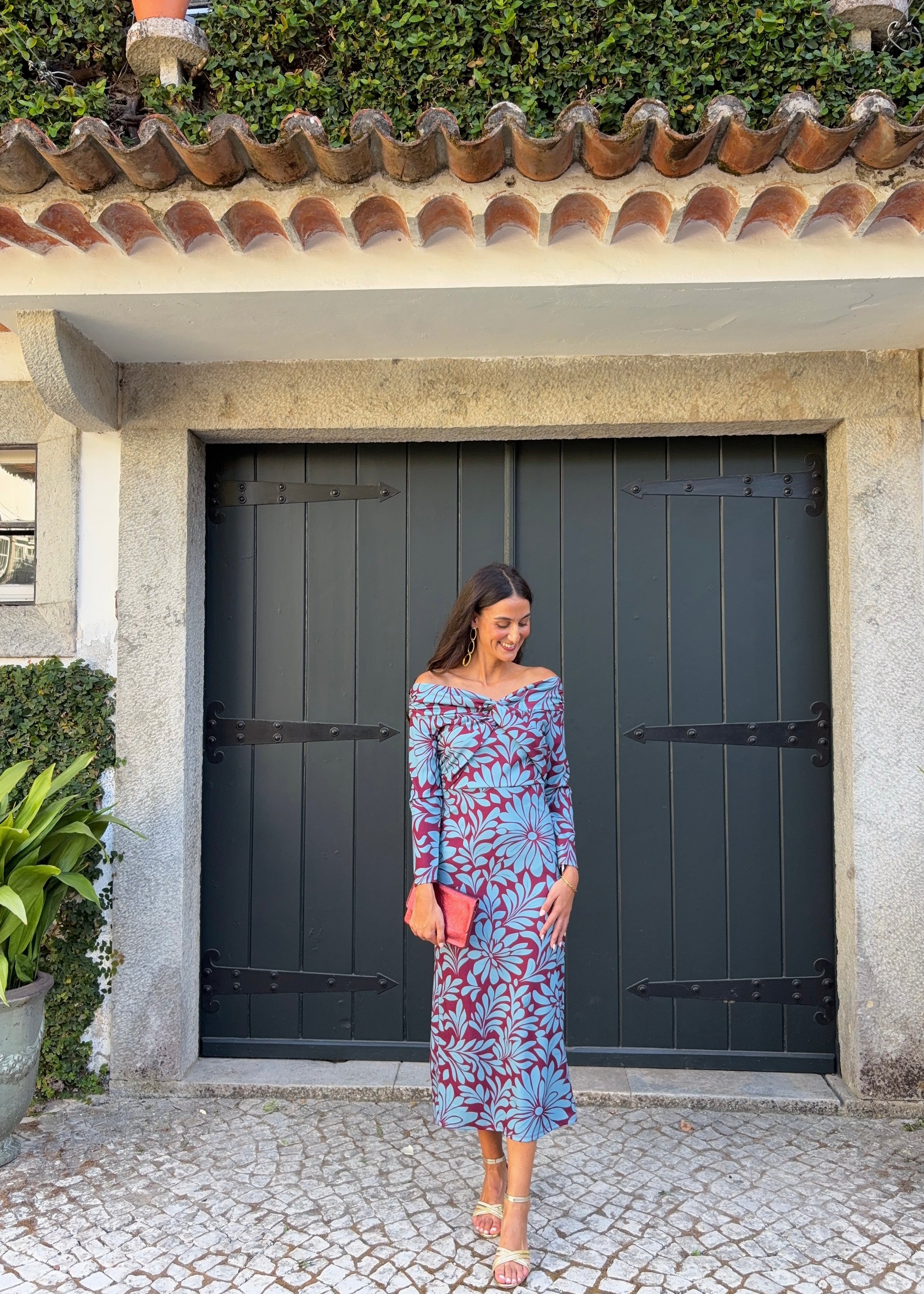 Vestido midi com decote drapeado em ombros caídos, realçando o colo de forma elegante. Corte justo que valoriza a silhueta.