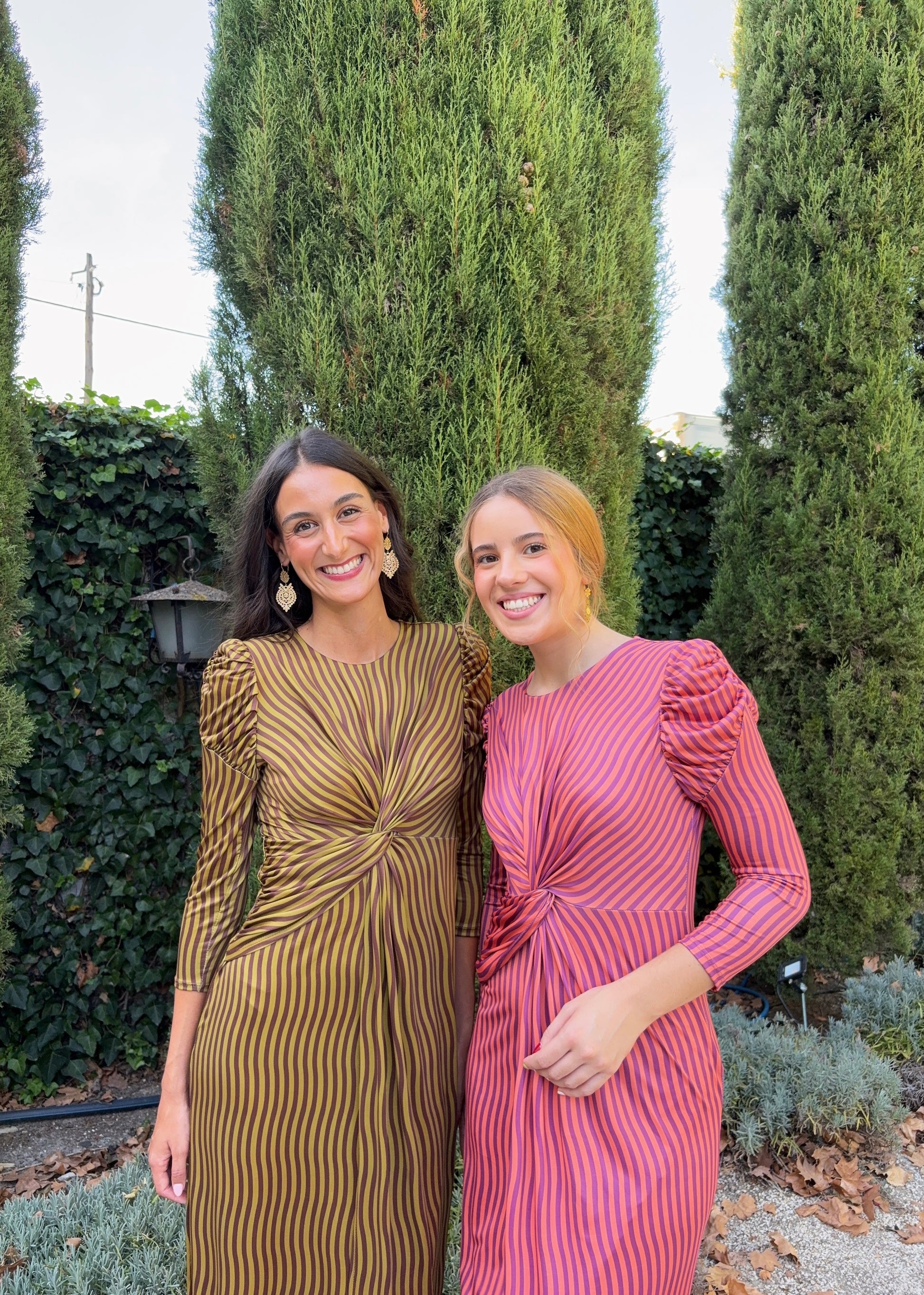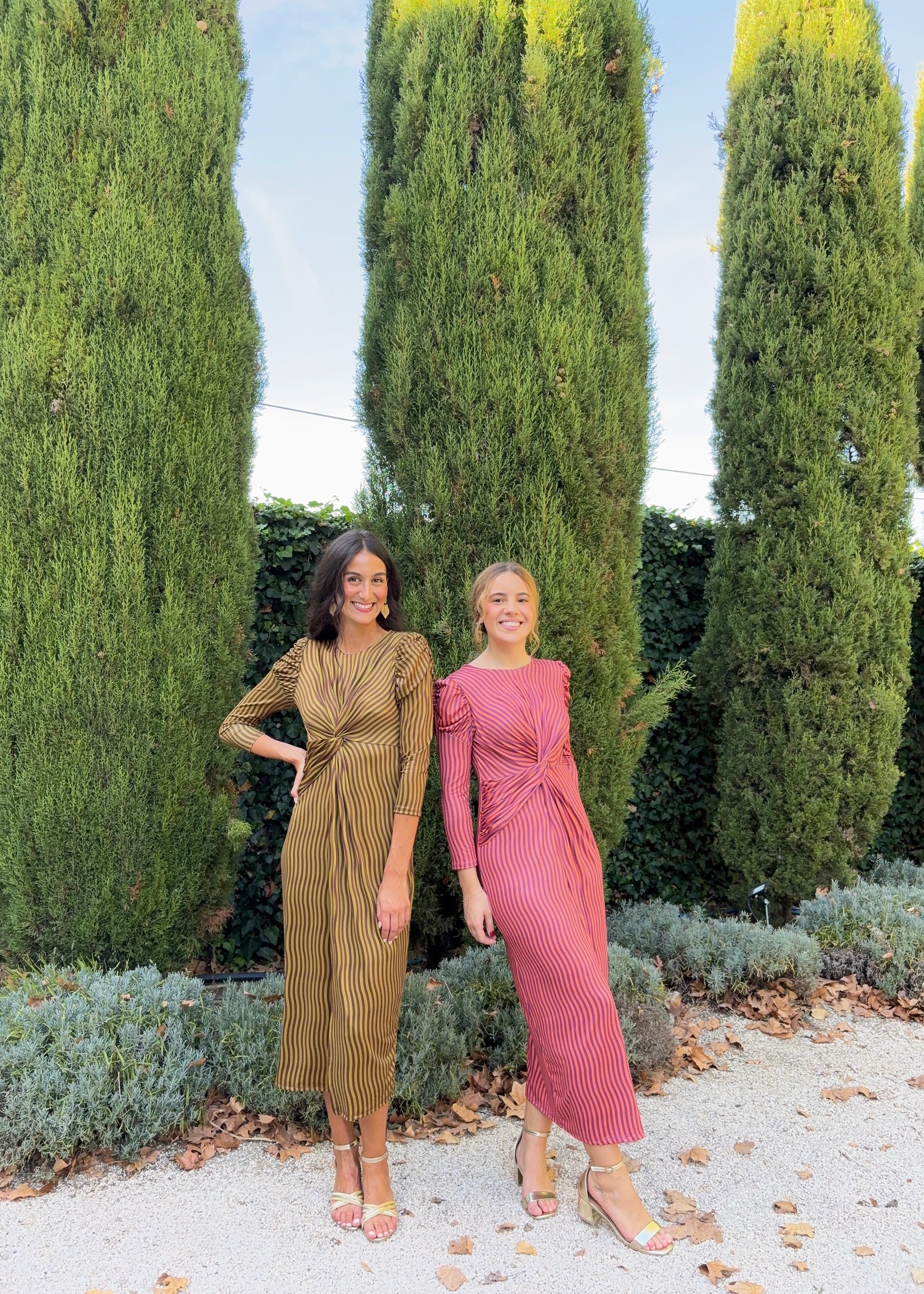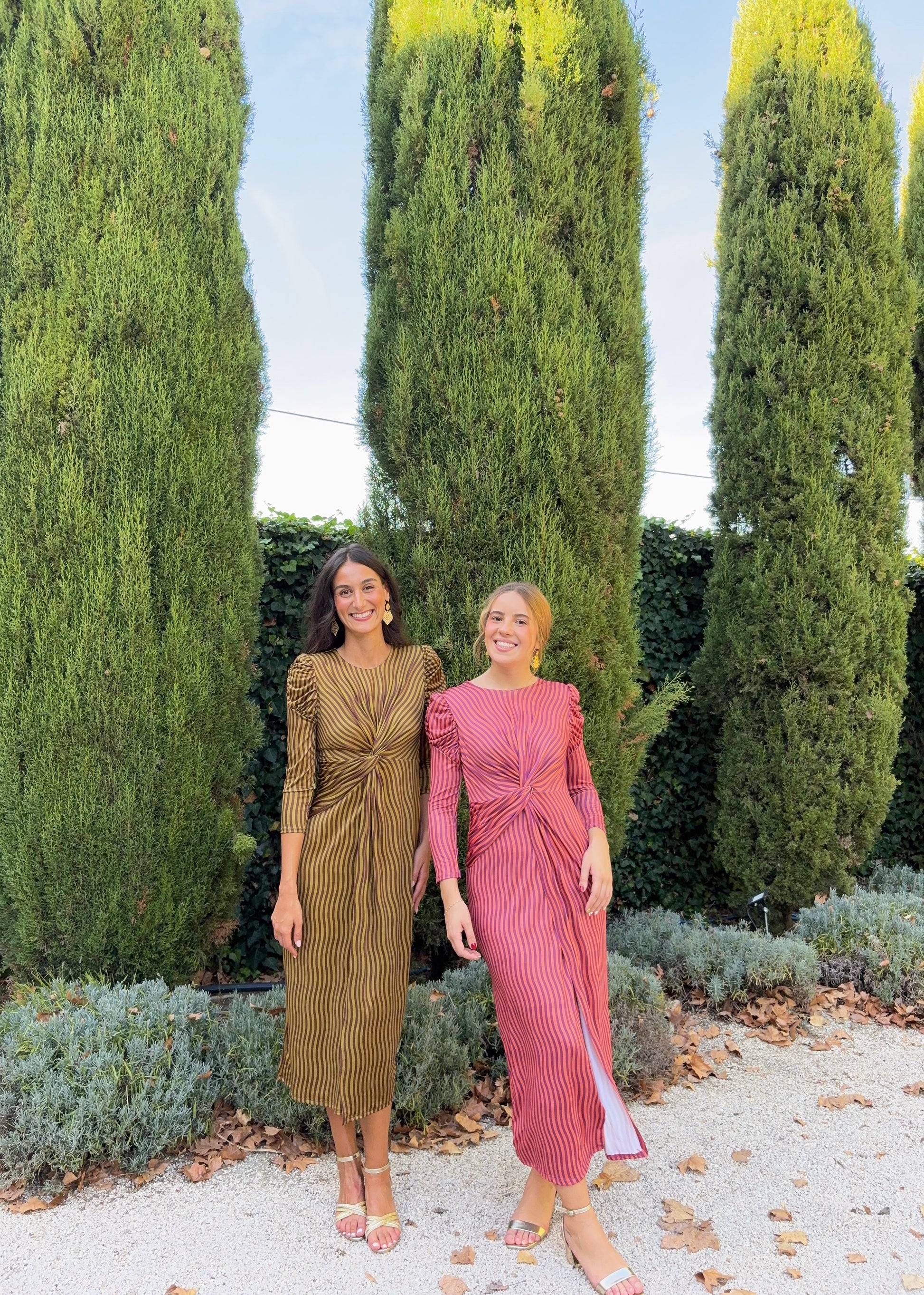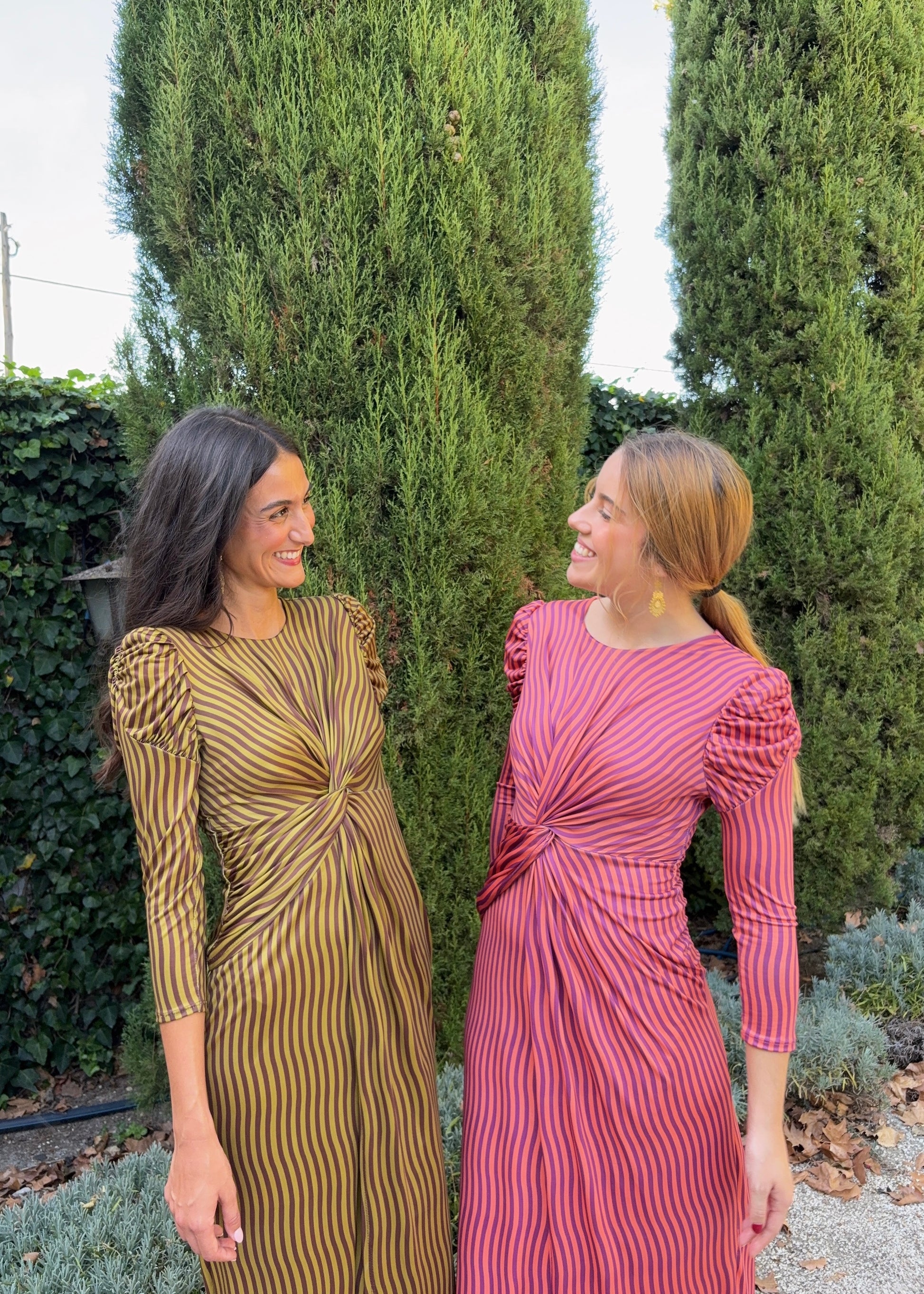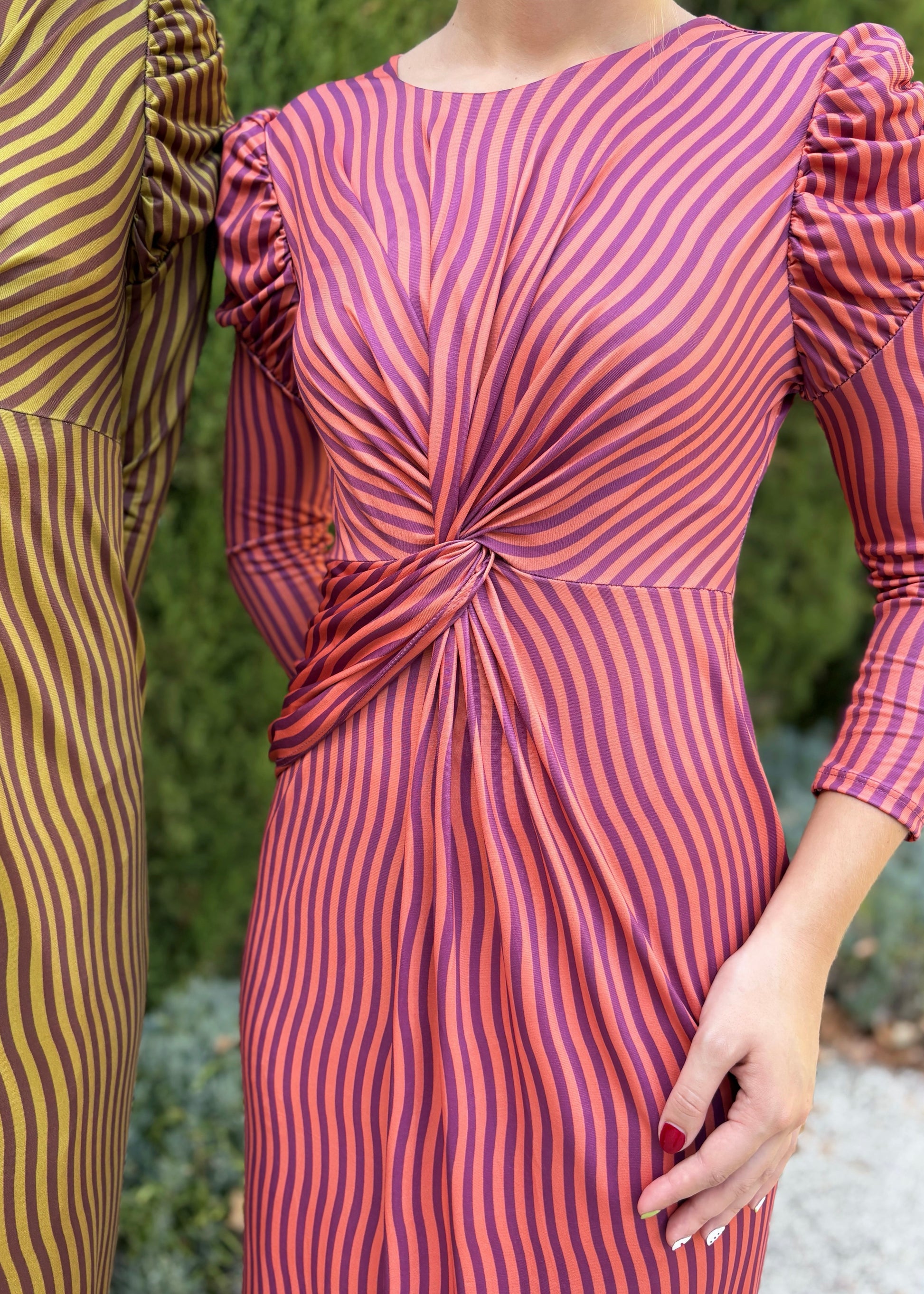 Vestido midi com riscas verticais e detalhe torcido na cintura, que realça a silhueta. Mangas com volume nos ombros para um toque elegante.