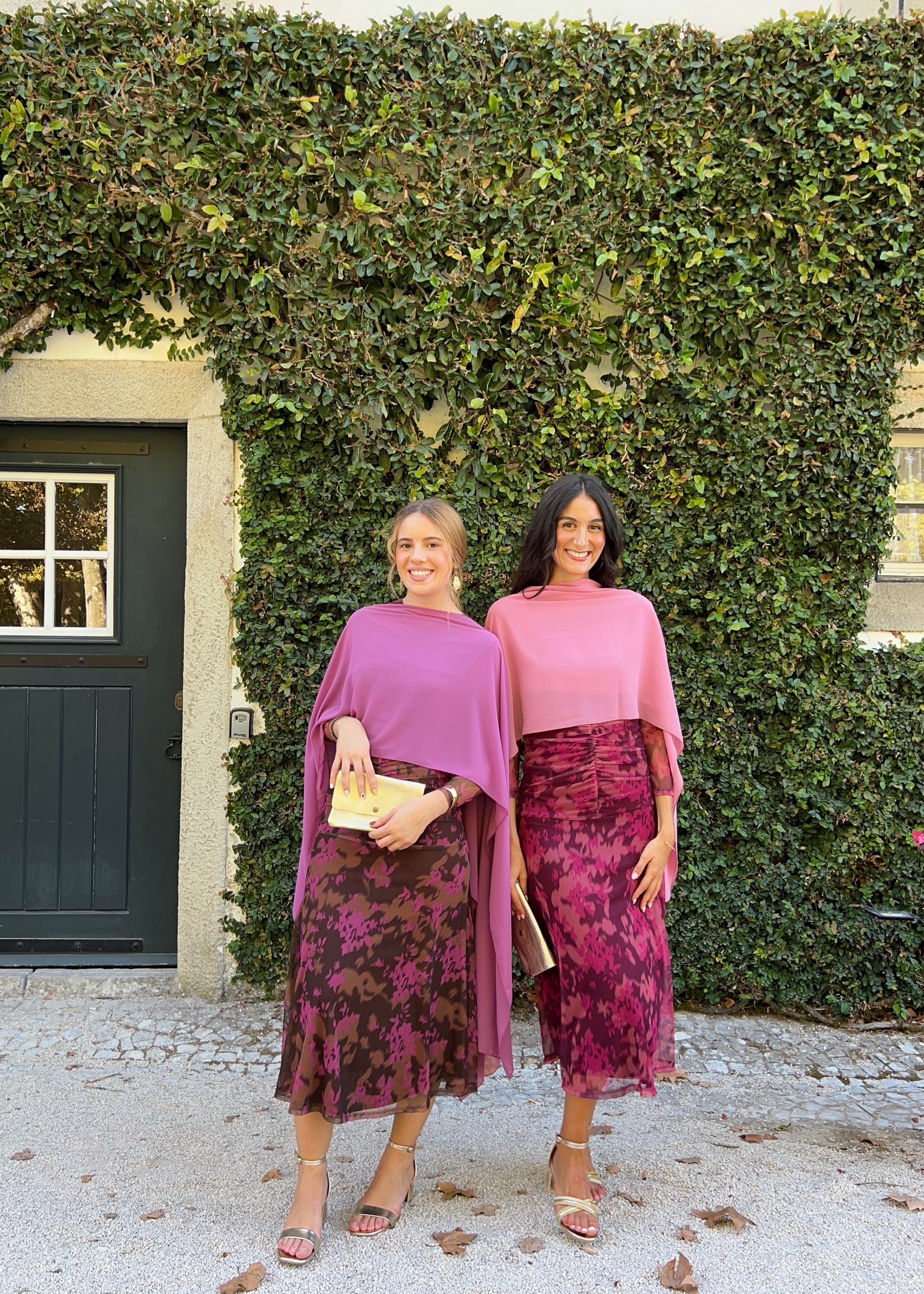 Vestido midi em tule com estampado floral em tons de vinho e rosa, com mangas compridas e decote fechado elegante. O detalhe franzido ao longo da frente valoriza a silhueta, enquanto o tecido leve garante movimento e fluidez. Um look sofisticado e romântico, ideal para eventos especiais.